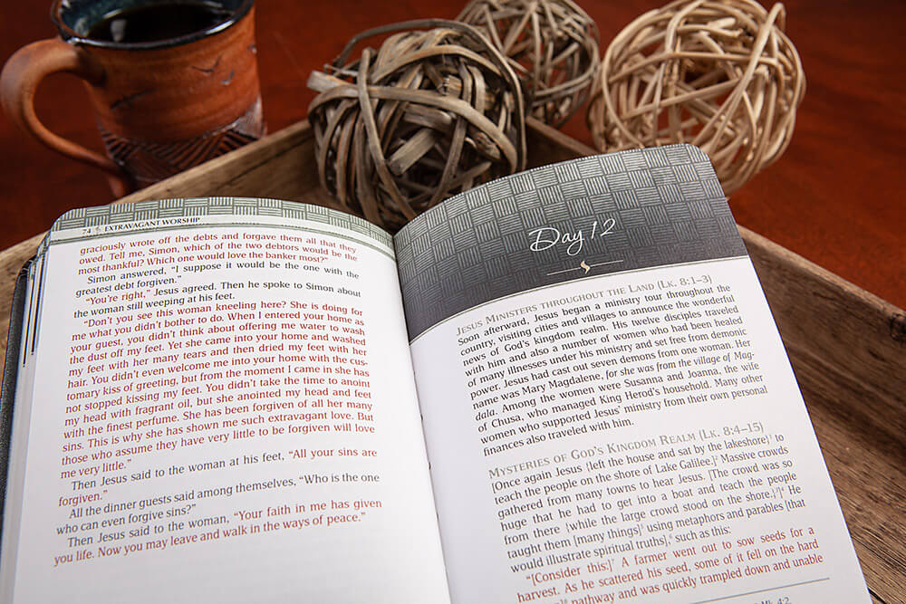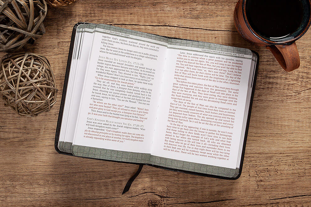 - Subject headings that introduce sections of the Bible text and its source in the Gospels